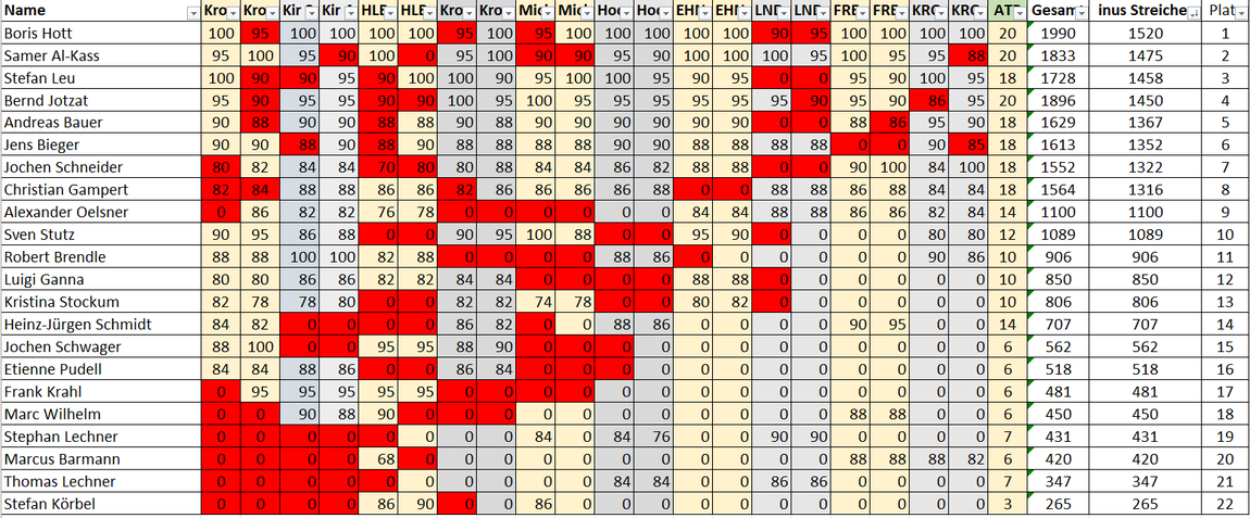 FINALER MEISTERSCHAFTSSTAND 2025 MIT 5 STREICHERGEBNISSEN (ROT MARKIERT), NACH DEM FINALE IN KRONAU